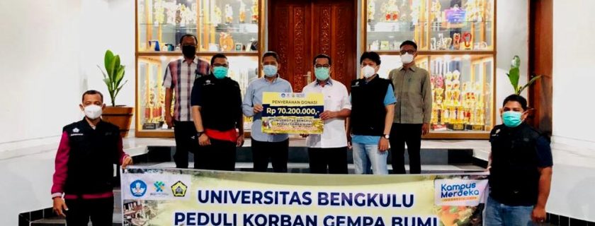 REKTOR UNIB Prof. Dr. Ridwan Nurazi, SE, M.Sc didampingi Wakil Rektor II Bidang Sumberdaya Dr. Ir. Sigit Sudjatmiko, M.Sc, Kepala Biro Umum dan Sumberdaya Ir. Akhmad Nezar dan Wakil Ketua PPID UNIB Dr. Yarjohan, menyerahkan donasi bencana gempa bumi Sulawesi Barat sekaligus melepas keberangkatan tim kemanusian yang akan berangkat ke Sulawesi Barat, Jumat pagi (5/2/2021).